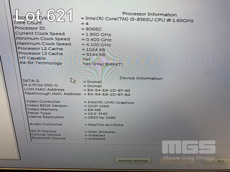 LAPTOP, DELL LATITUDE 5300, CORE i5 8365U (8TH GEN) @ 1.6GHz, 8GB DDR4 RAM, NO HDD, 13.3" WIDESCREEN (1920x1080) & POWER SUPPLY (NOTE: MARKS ON SCREEN) S/N:2VCYLT2