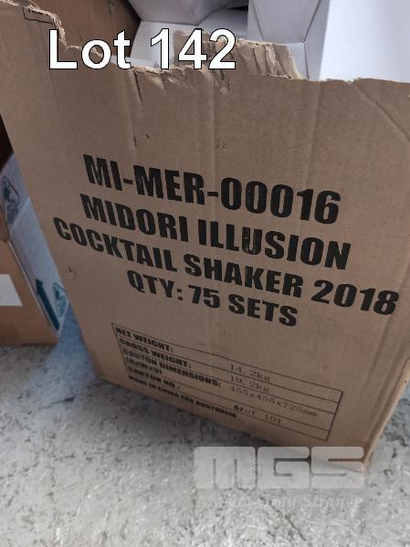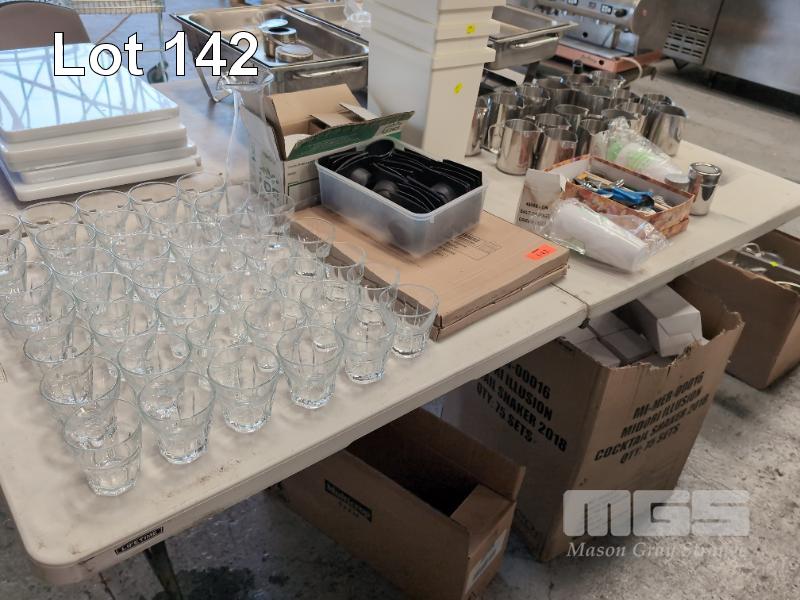 ASSORTED GLASSES, CUTLERY, CROCKERY, MILK JUGS, FRIAND CASES, MIDORI SHAKERS ETC. CONTENTS 1 X TABLE AND 1 X CARTON.