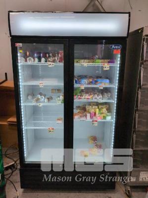 1 X 2-DOOR RETAIL UPRIGHT DISPLAY FRIDGE. ILLUMINATED. MODEL P1000WB. 1,130 X 720 X 2,000 MM (W D H). 240V.