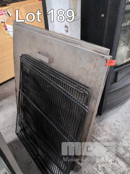 2 X STAINLESS STEEL COVER LIDS WITH HANDLES. SQUARE. 1,130 MM SIDES. 4 X COATED WIRE SHELVES. 780 X 820 MM.