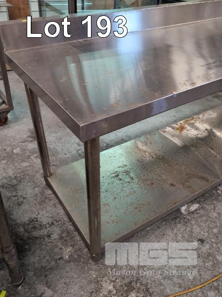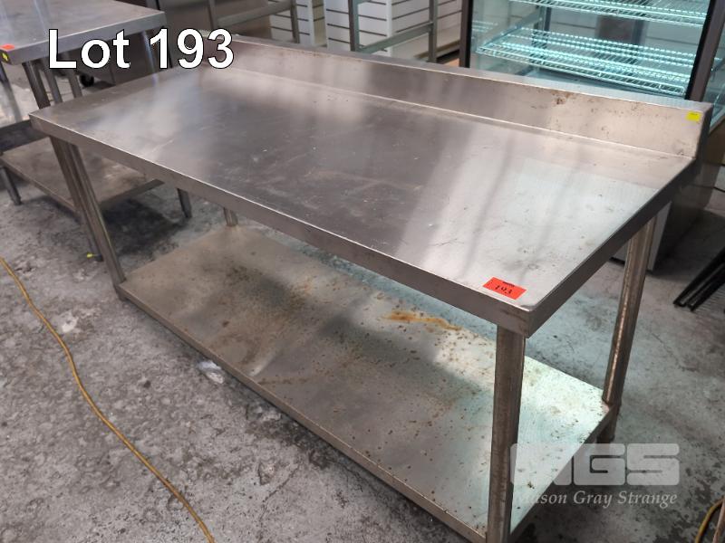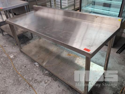 1 X BUTCHER'S STAINLESS STEEL PROCESS/ CHOPPING BENCH WITH SPLASHBACK AND UNDER SHELF. 1,800 X 700 X 850 MM (W D H). ** RUST SPOTS ON UNDER SHELF && TWO FEET MISSING **