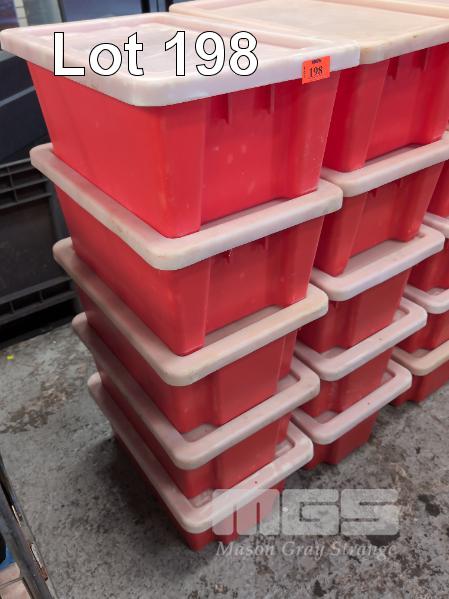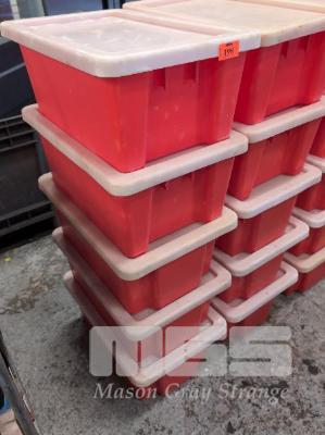 5 X 52 LITRE REUSABLE STACK & NEST FOOD CRATES WITH LIDS. RED.