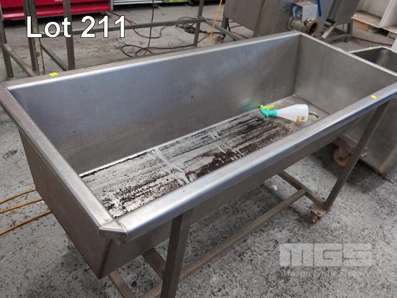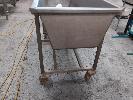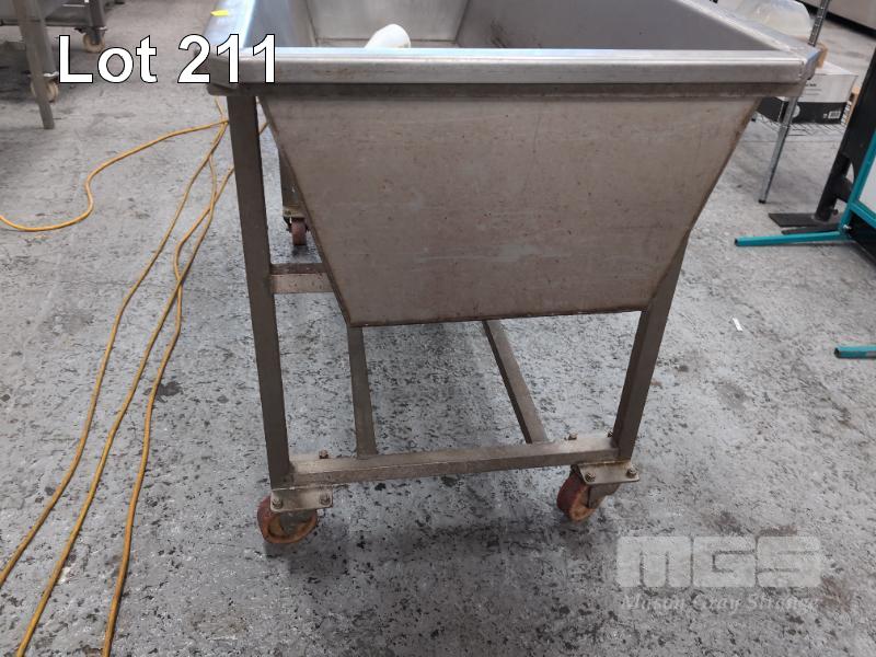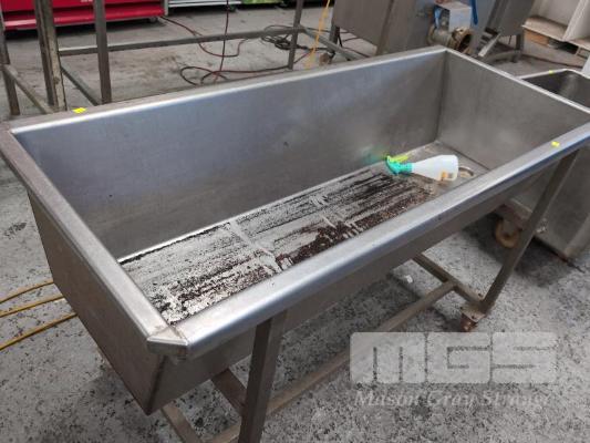 1 X BUTCHER'S MOBILE RETANGULAR STAINLESS STEEL HOPPER WITH DRAIN PLUG. 1,500 X 645 X 870 MM (OVERALL W D H).