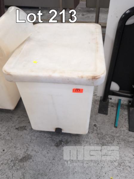 1 X MOBILE 230 LITRE (EST.) FOOD GRADE PLASTIC RECTANGULAR TUB. WITH DRAIN PLUG & LID. 700 X 550 X 750 MM (OVERALL W D H).