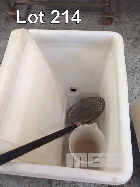 1 X MOBILE 230 LITRE (EST.) FOOD GRADE PLASTIC RECTANGULAR TUB. WITH DRAIN PLUG & LID. 700 X 550 X 750 MM (OVERALL W D H).