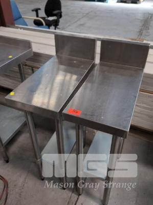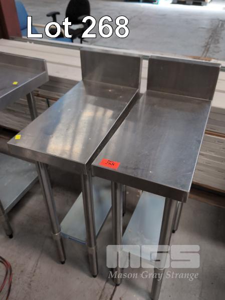 2 X STAINLESS STEEL COMMERCIAL KITCHEN INFILL BENCHES BOTH WITH UNDERSHELF AND SPLASHBACK. 300 X 610 X9 05 MM (W D H).