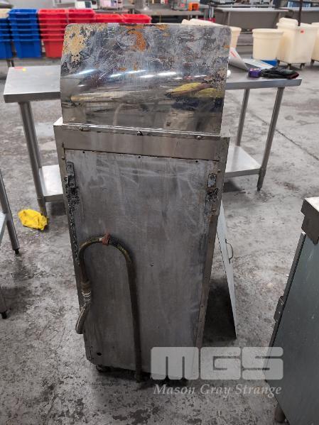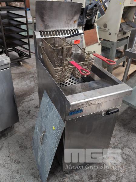 1 X WALDORF FREESTANDING LPG DEEP FRYER. MODEL FN8120G. 450 X 850 X 1,350 MM (W D H). WITH GALV COVER AND 3 X BASKETS