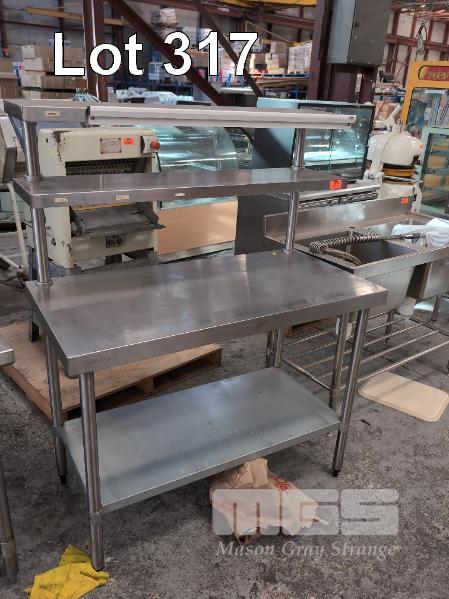 1 X STANLESS STEEL COMMERCIAL KITCHEN PREP BENCH WITH UNDERSHELF AND 2 X TOP SHELVES. BENCH 1,200 X 60 X 900 MM (W D H). TOP SHELVES 900 X 300 (W D).