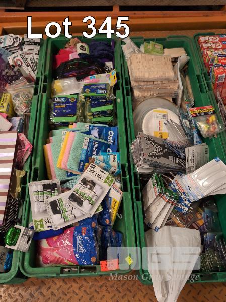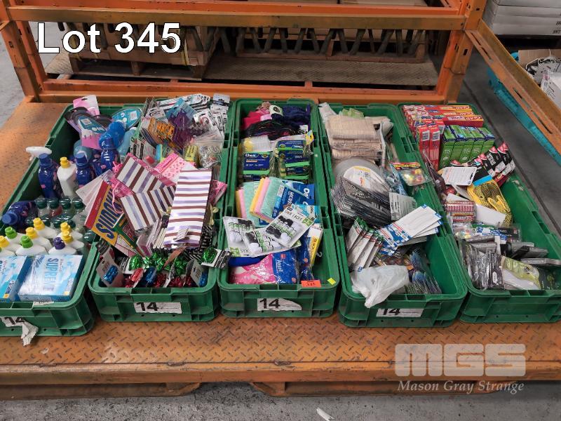 SELECTION OF CONVENIENCE STORE GROCERY STOCK. INCLOUDES ASSORTED HOUSEHOLD CLEANING SUPPLIES, STATIONARY & HARDWARE ETC. CONTENTS 5 X GREEN TUBS. GREEN TUBS NOT INCLUDED.