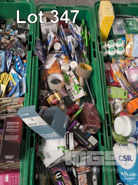 SELECTION OF CONVENIENCE STORE GROCERY STOCK. INCLUDES ASSORTED BATTERIES & HARDWARE, CHEWING GUMS, INSTANT COFFEE, OFFICE SUPPLIES ETC CONTENTS 3 X GREEN TUBS. GREEN TUBS NOT INCLUDED.