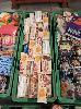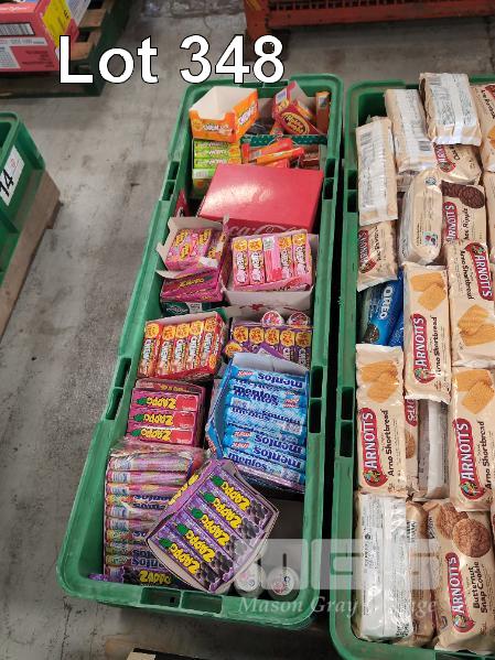 SELECTION OF CONVENIENCE STORE GROCERY STOCK. ASSORTED FOODSTUFFS INCLUDES BISCUITS, BEEF JERKY, CHOCOLATE BARS, CHEWING GUMS & LOLLIES ETC CONTENTS 4 X GREEN TUBS & 3 X CARONS. GREEN TUBS NOT INCLUDED.