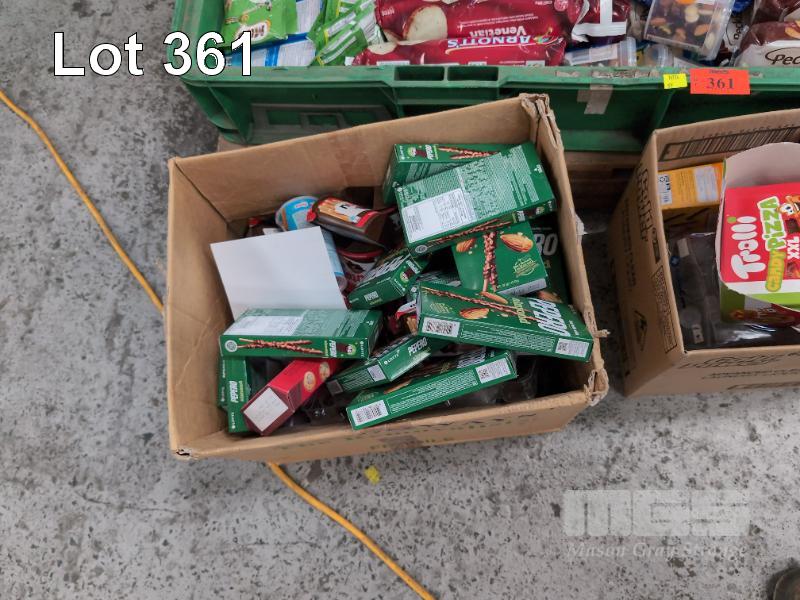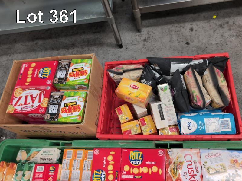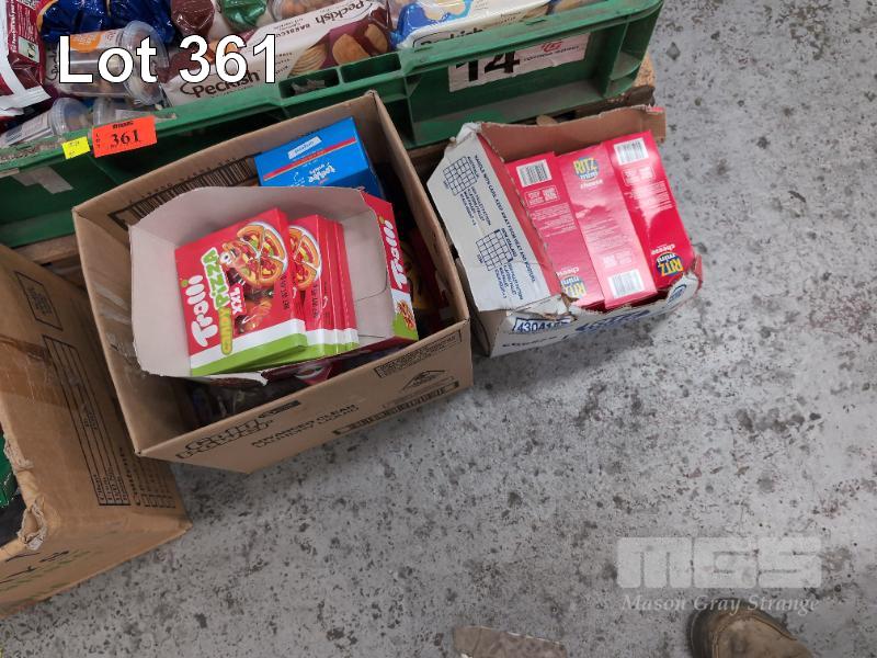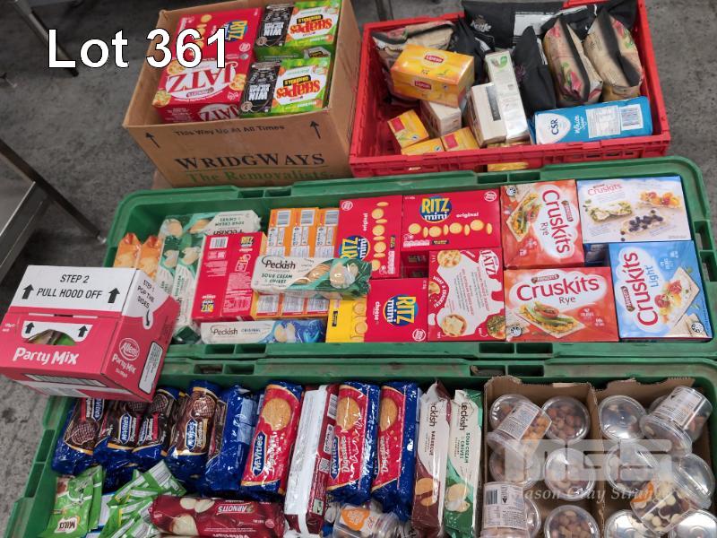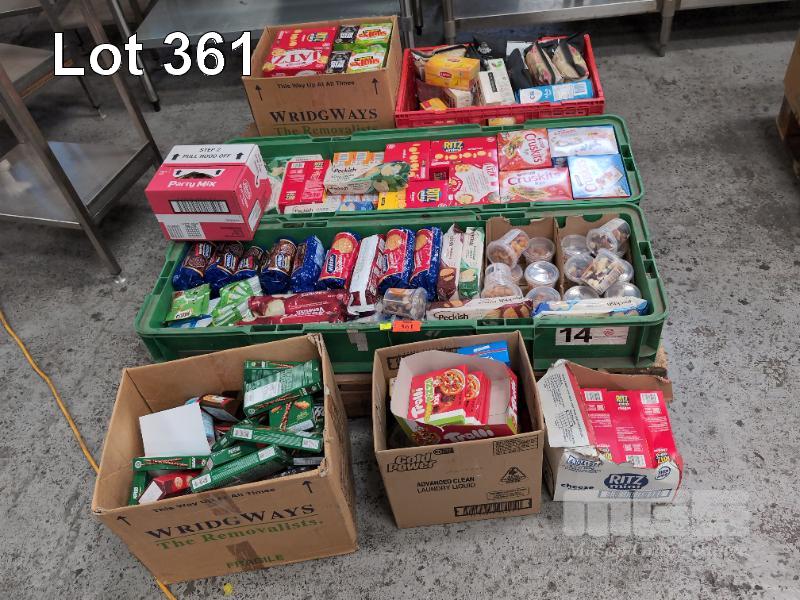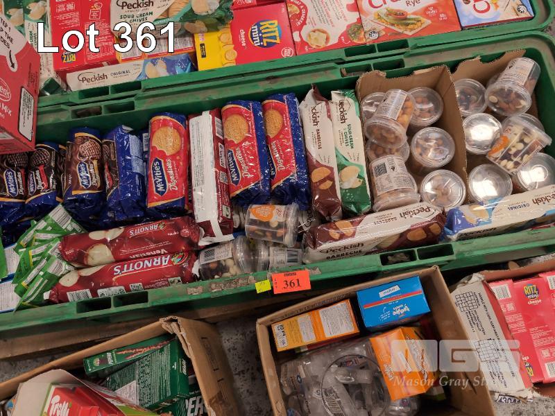 SELECTION OF CONVENIENCE STORE GROCERY STOCK. ASSORTED FOODSTUFFS. INCLUDING BISCUITS, HAND SANITIZER, NUTS, CRACKERS, CHIPS, TEA, NUTELLA SNACKS ETC CONTENTS 1 X PALLET. CRATES NOT INCLUDED.