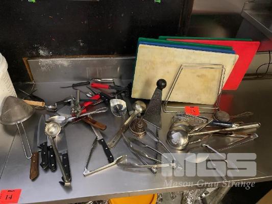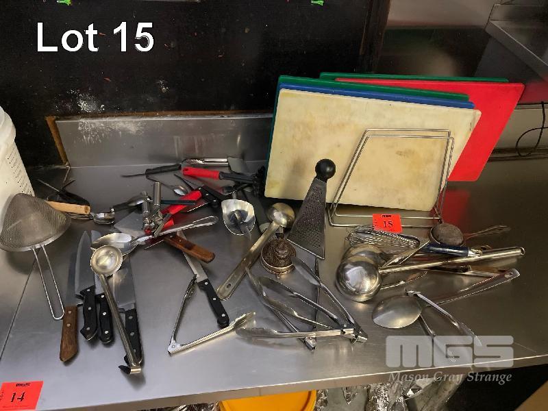 LARGE QTY KITCHEN UTENSILS, KNIVES, TONGS, CUTTING BOARDS ETC.