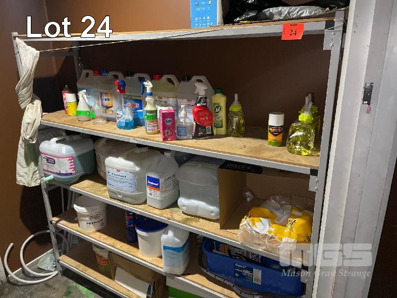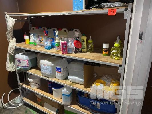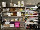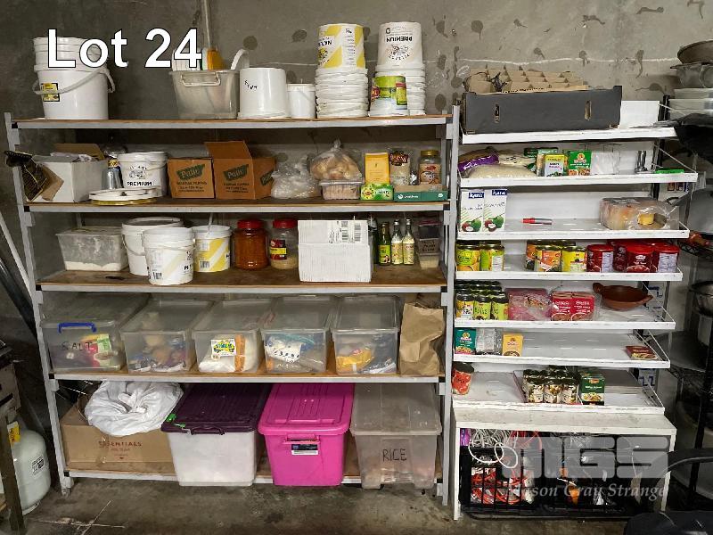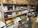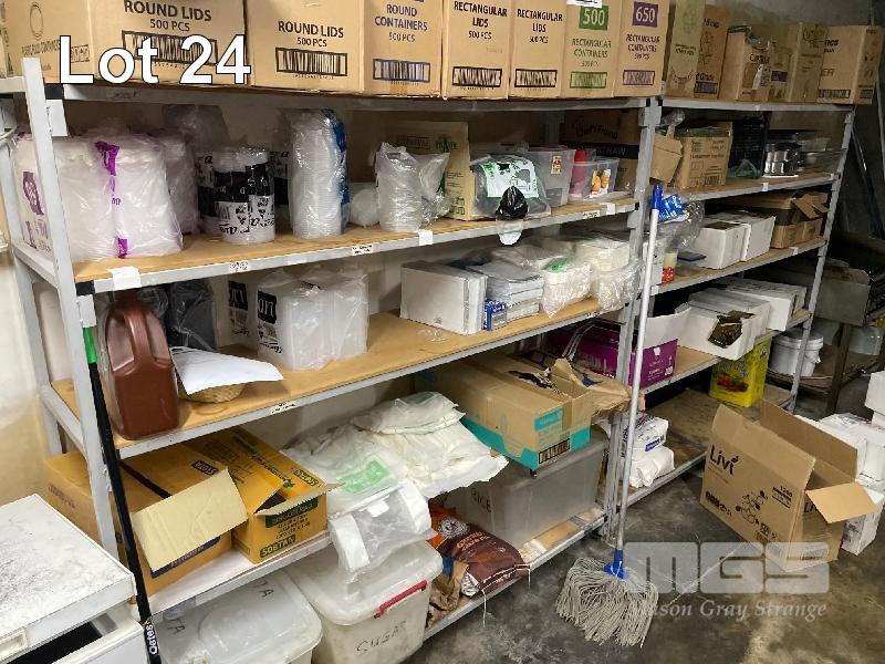 4 x STEEL FRAME STORAGE RACKS, 5 TIER, PARTICLE BOARD SHELVES, 1800 x 350 x 1600mm (H) PLUS CONTENTS, LARGE QUANTITY TAKE AWAY CONTAINERS, CANNED FOOD ETC.
