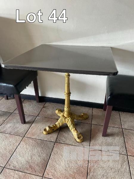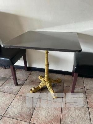 3 x PEDESTAL TABLES, 900 x 900mm, GOLD COLOUR LEGS TIMBER LAMINATE TOPS PLUS ONE DAMAGED