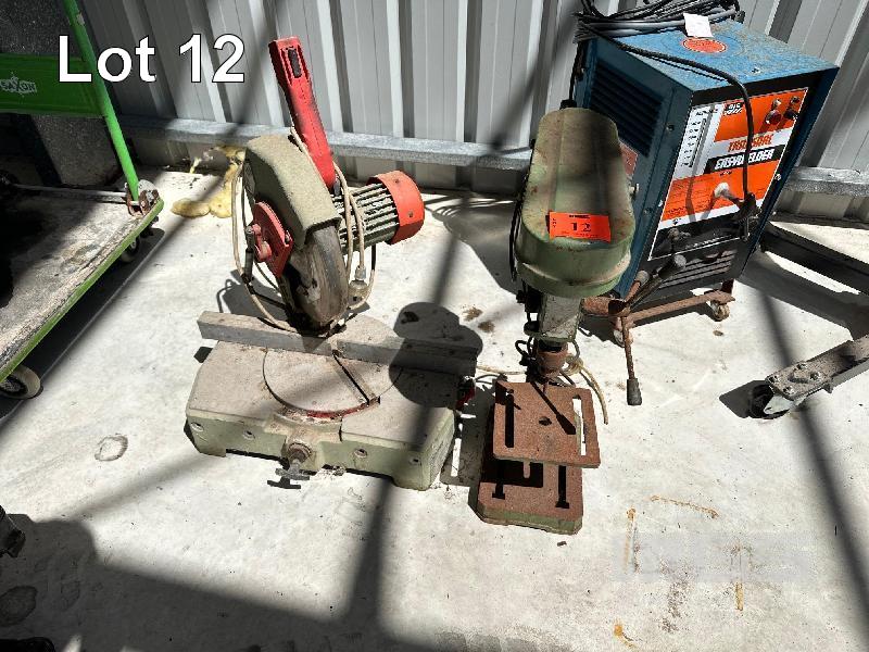 OMCA MITRE SAW, MOD: AL159300, 240V 10AMP PLUG, WITH SMALL PEDESTAL DRILL, 240V 10 AMP PLUG, CONDITION UNKNOWN