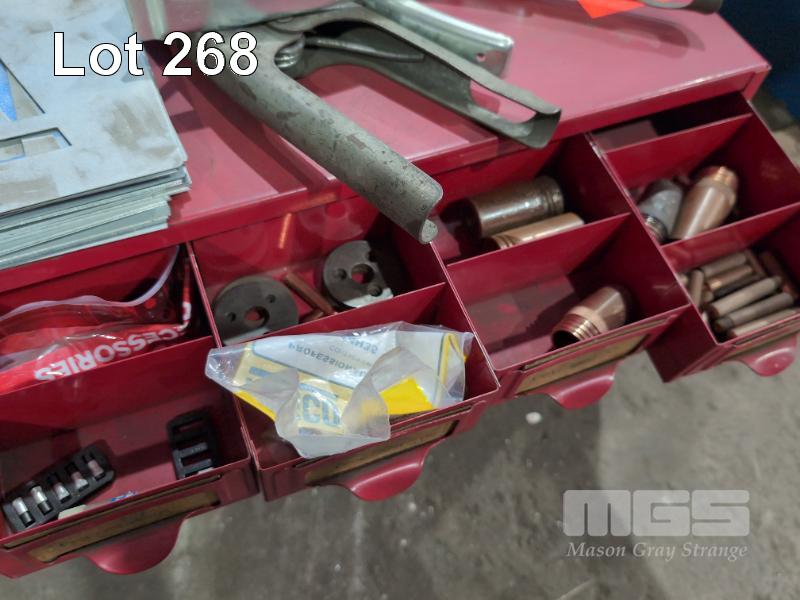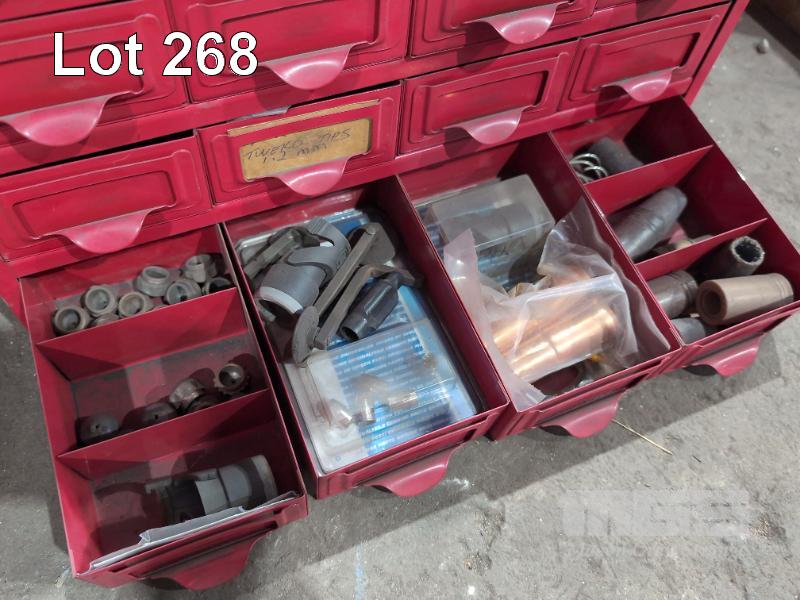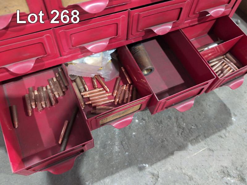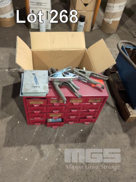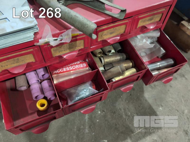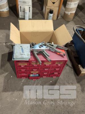 METAL 16 DRAWER CABINET & CONTENTS COPPER AND BRASS FITTINGS, STENCILS, CLAMPS , POP RIVET GUN
