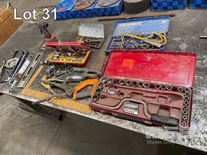 ASSORTED SOCKETS & HAND TOOLS, AIR RIVETER, SQUARE, LEVEL, WAD PUNCHES