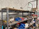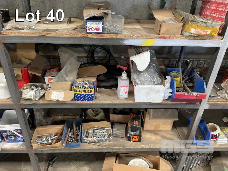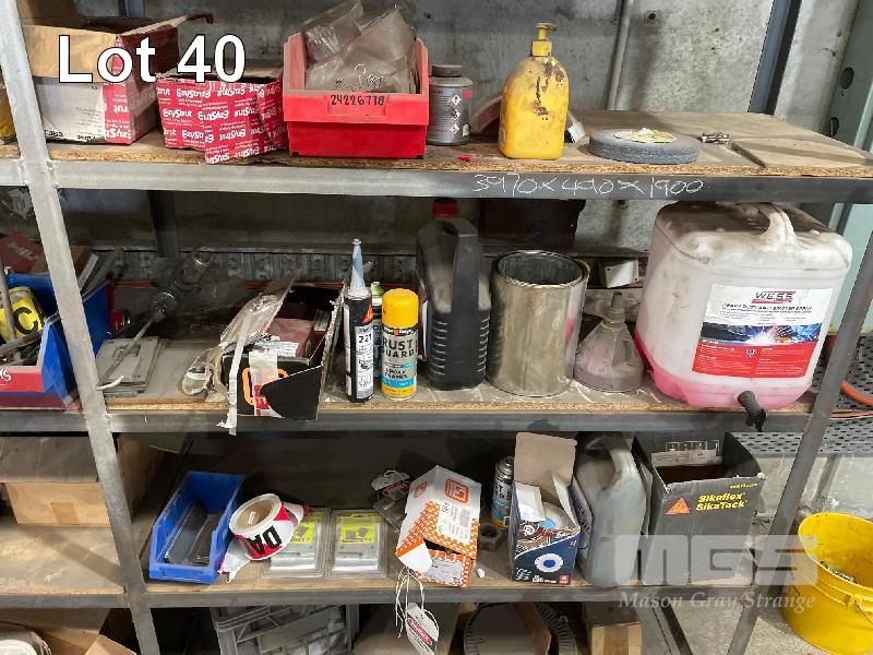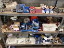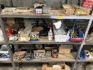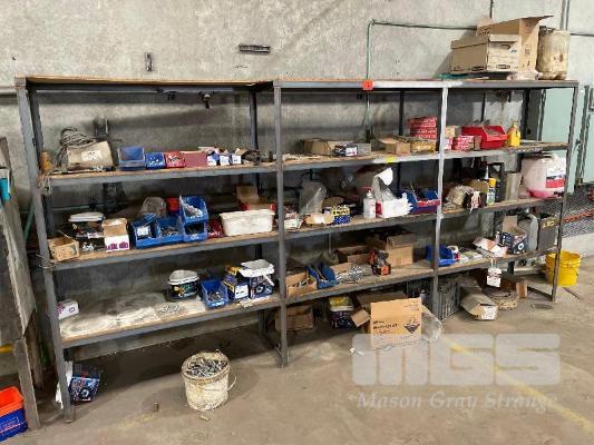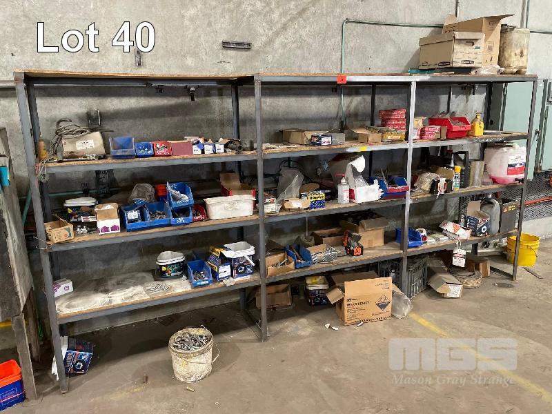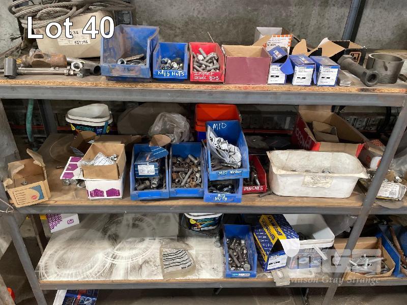 STEEL FRAME RACK & CONTENTS, 4 TIER, 3970 (L) x 490 (D) x 1900mm (H) WITH NUTS, BOLTS, WASHERS, OIL, HINGES & MORE