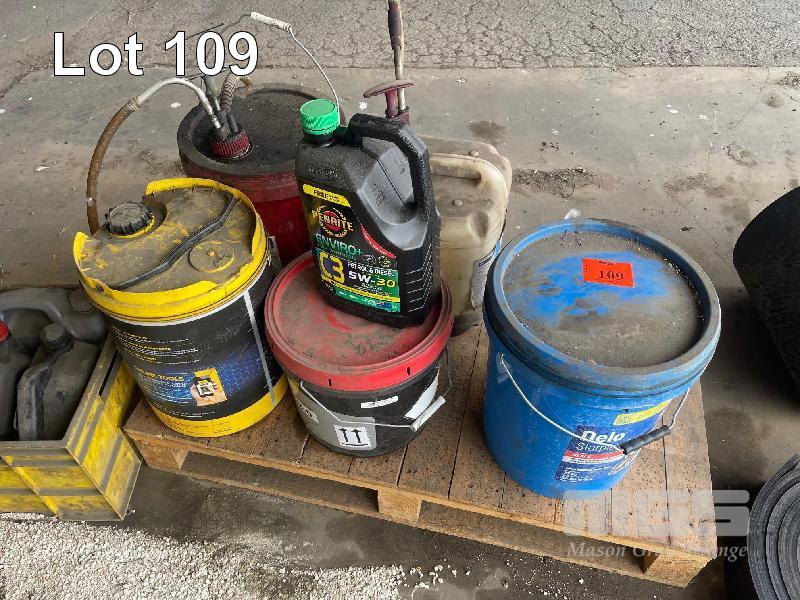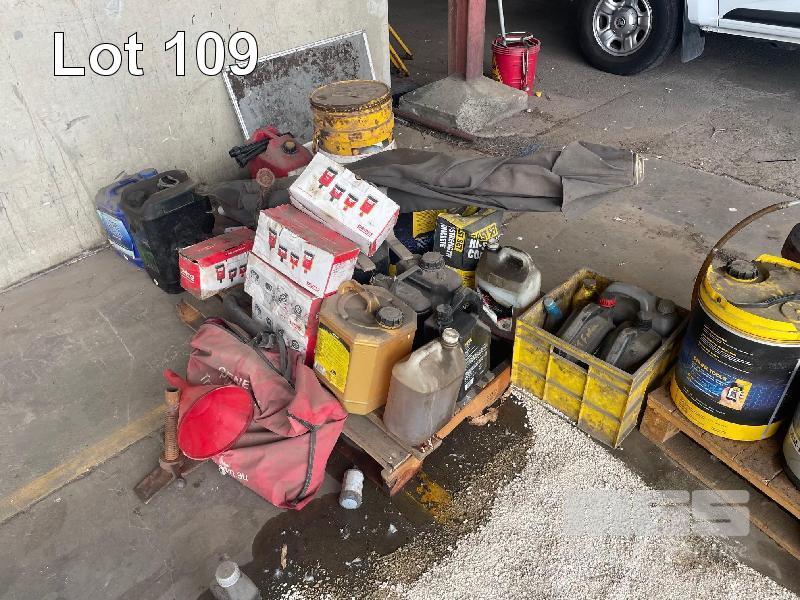 ASSORTED CONTAINERS, VARIOUS OILS & GREASE, COOLANTS, FUNNELS, FUEL DRUM & BRAKE FLUID