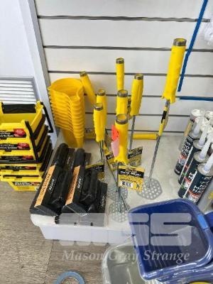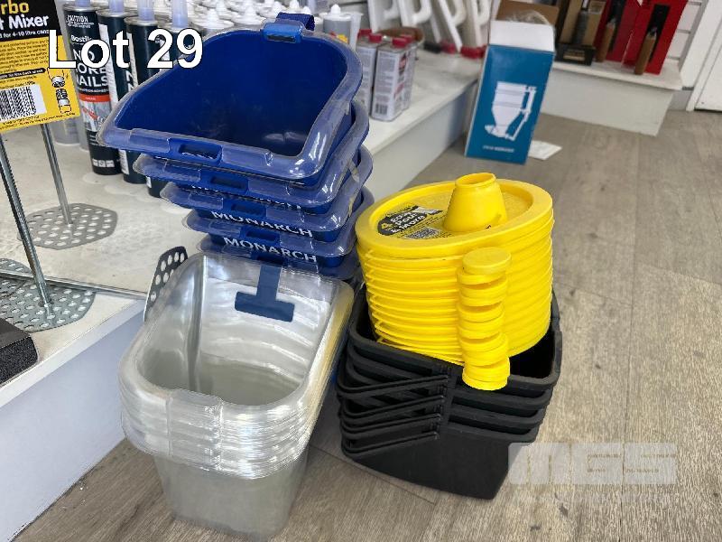 8 x HAND PAINT MIXERS, 7 x ABRASIVE BLOCKS & 11 x PLASTIC PAINT POTS