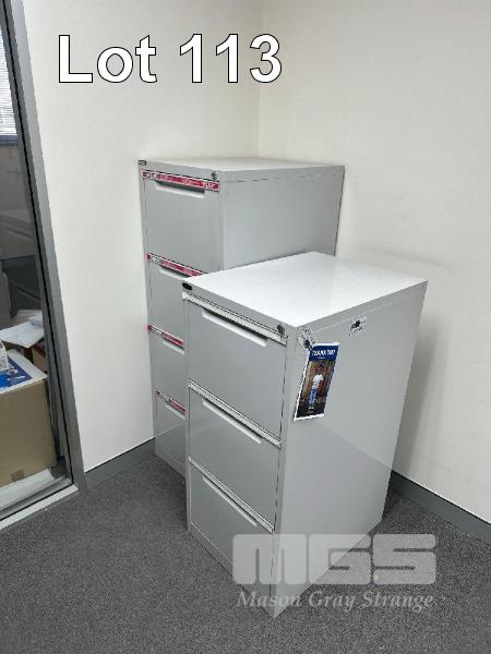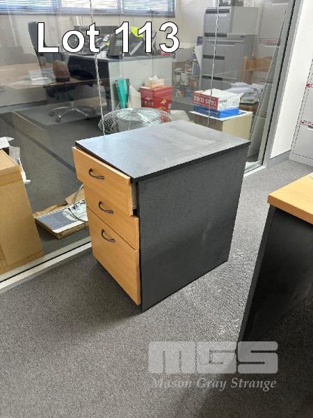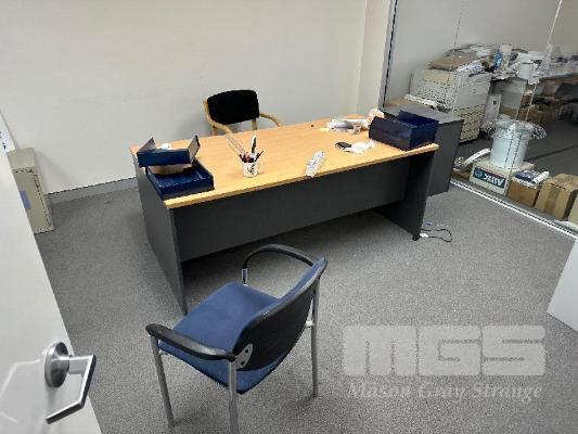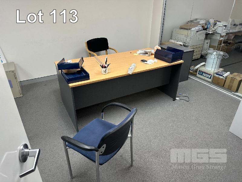 CONTENTS OF OFFICE INCLUDING TIMBER LAMINATE DESK & MOBILE, 3 & 4 DRAWER FILING CABINETS, GREY STEEL & 2 x CHAIRS