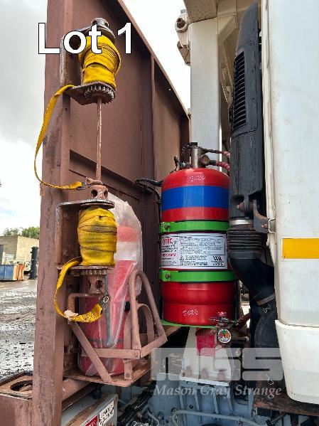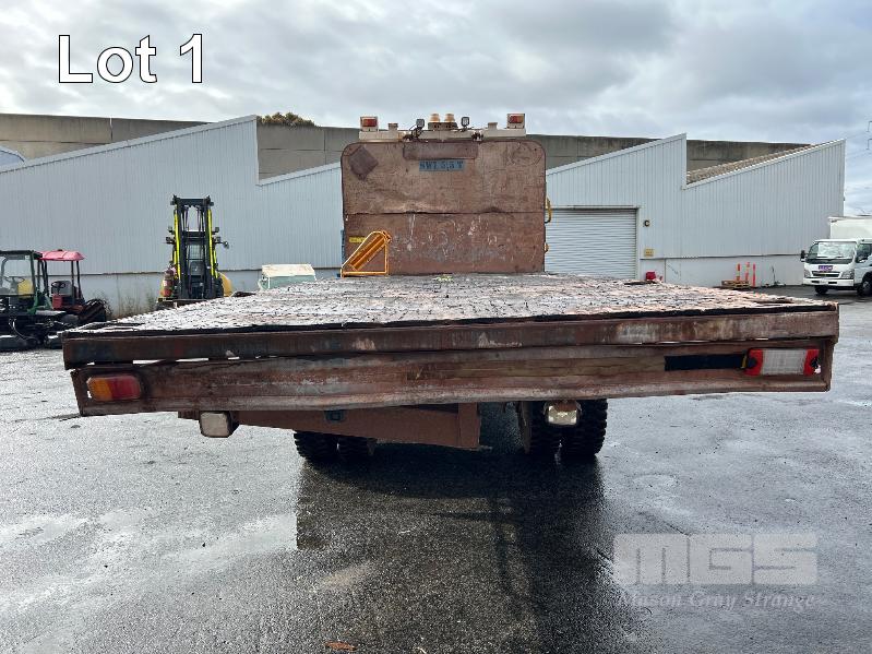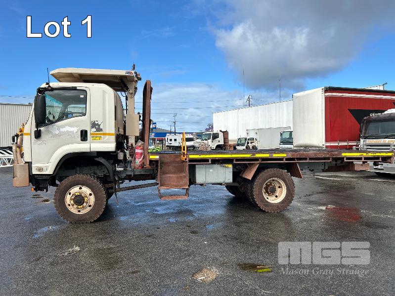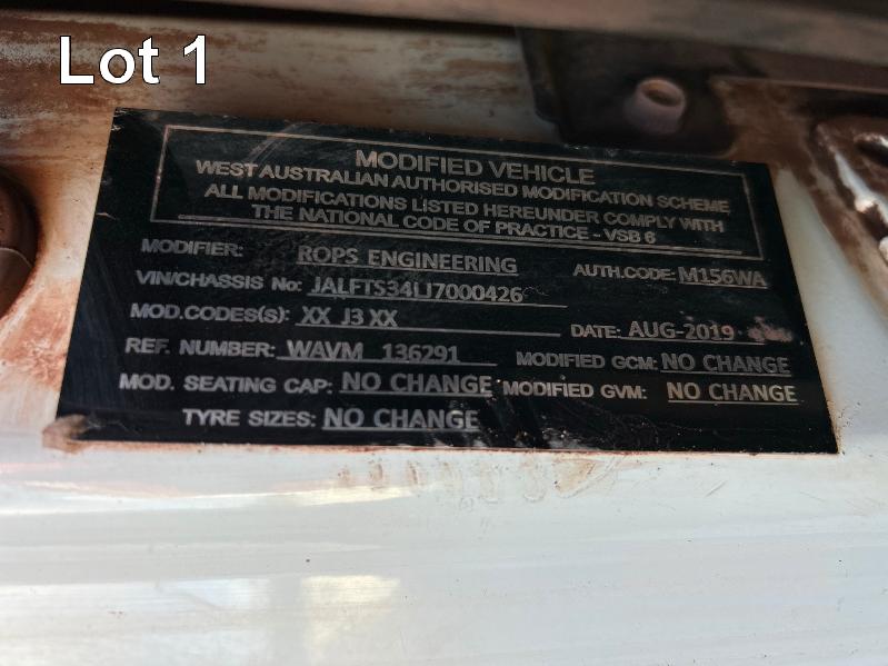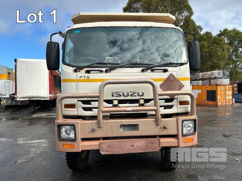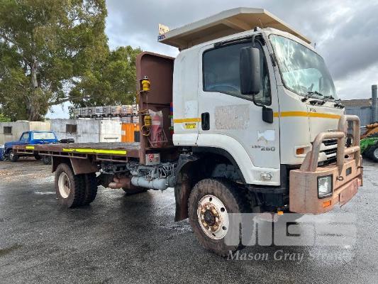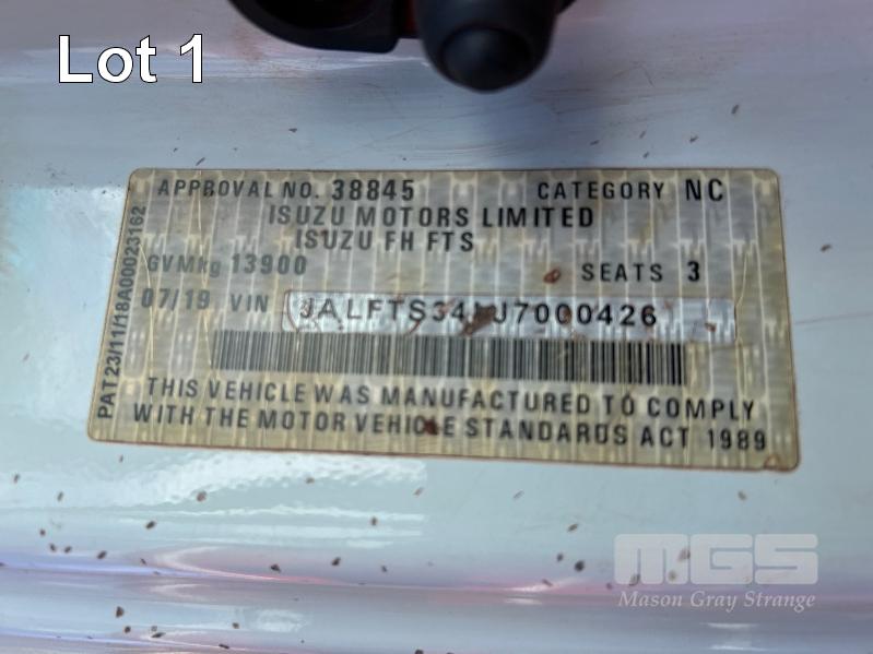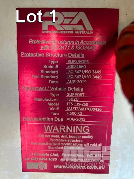 2019 ISUZU FH-FTS139-260 4x4 SINGLE CAB TRAYTOP TRUCK REG: NO PLATES VIN: JALFTS34LJ7000426 ODO: 58,155kms SHOWING GVM: 13,900kg GCM: 20,500kg 6 CYLINDER TURBO DIESEL, 6 SPEED MANUAL TRANSMISSION, SPRING SUSPENSION, WHITE DUCO, 11R 22.5 2 DOORS, 3 SEAT, AIR CON, BULL BAR, STEEL TRAY, MINE SPEC FIRE SUPPRESSION SYSTEM, MUIRHEAD BATTERY ISOLATION SWITCHES, REVERSE CAMERA & LCD, REA, ROPS & FOPS CANOPY OVER CAB WARNING LIGHTS, ABT EMERGENCY BRAKE SYSTEM TRAY SIZE 6000x2500mm FITTED WITH SIDE MOUNTED STEPS & 6 x CONTAINER LOCKING PINS KEY #7 (WITH 1 KEY/S)