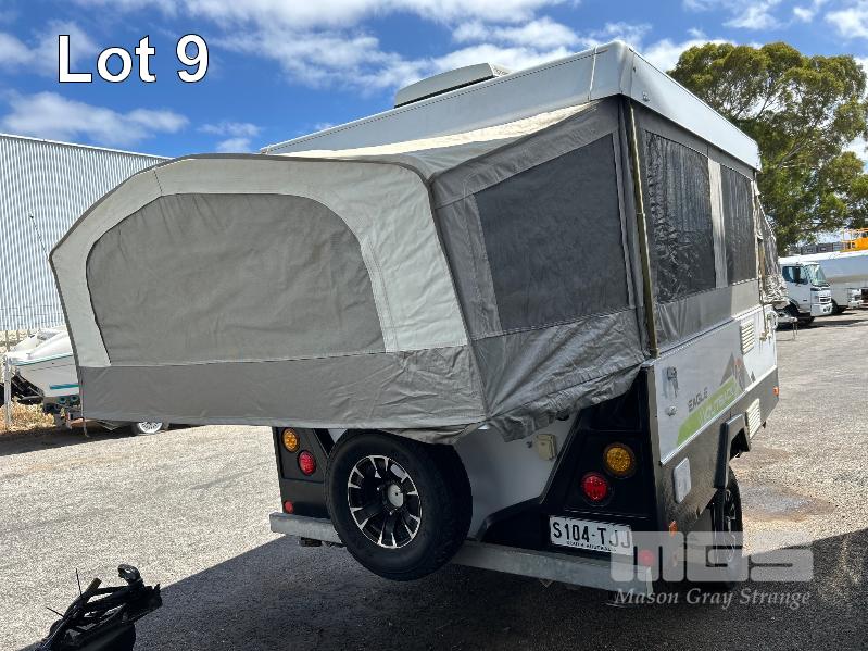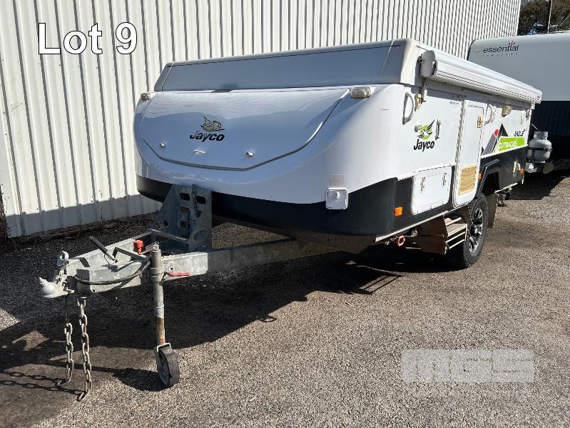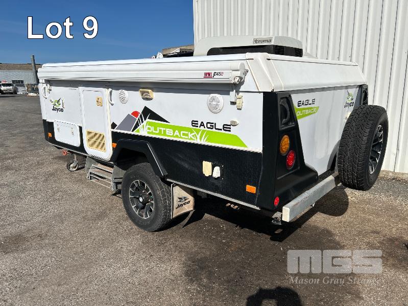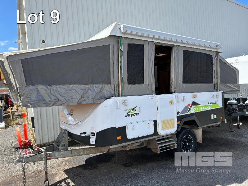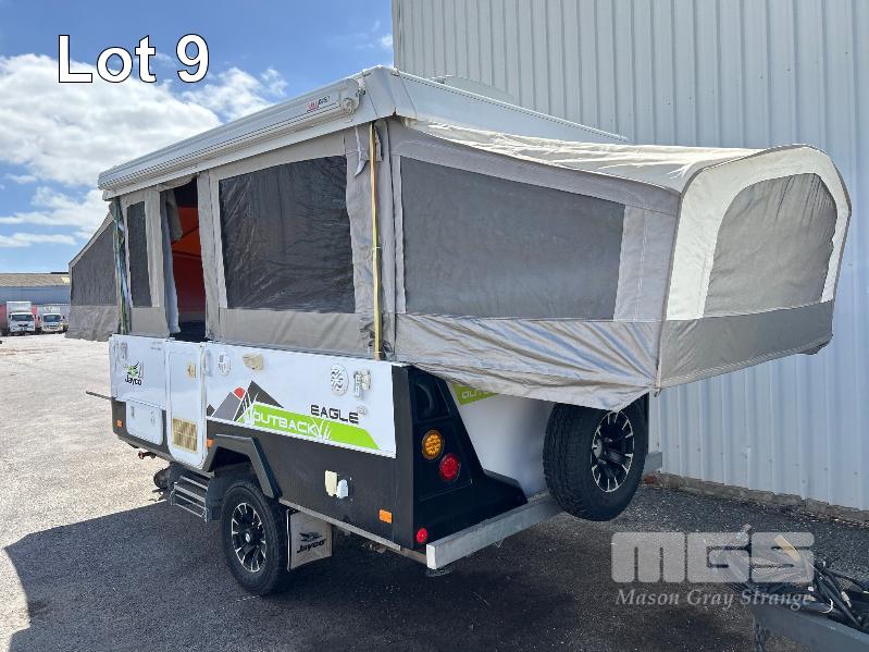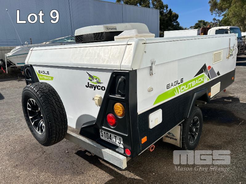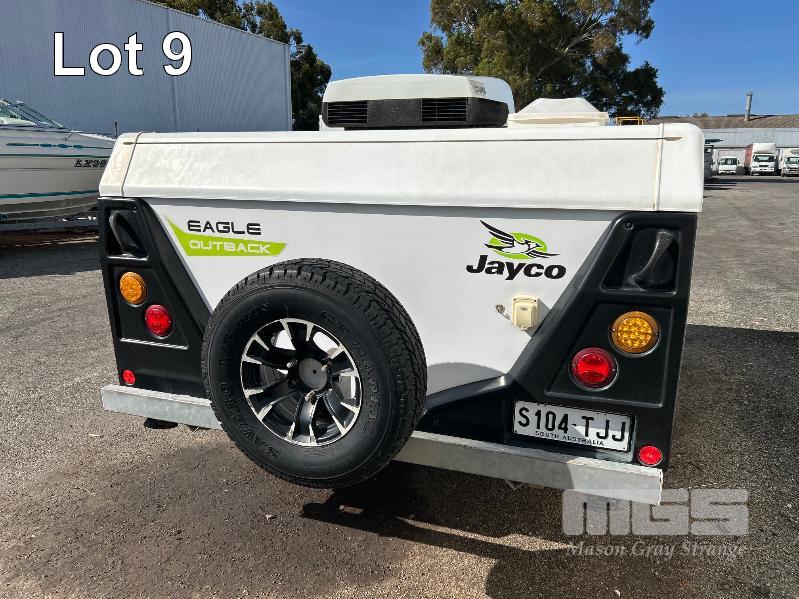 2013 JAYCO EAGLE OUTBACK, 13 Ft POP TOP CARAVAN REG: S104 TJJ (SA) VIN: 6AM000000D1R16263 SINGLE AXLE, OFF ROAD WHITE/BLACK FINISH, SLEEPS 5 PEOPLE BALL HITCH, ELECTRIC BRAKES FULL KITCHEN INCLUDING COMETIC GAS/ELEC STOVE/GRILL, MICROWAVE, THETFORD 3 WAY FRIDGE TRUMA, ROOF MOUNT A/C UNIT, MODLE: AVENTA COMFORT STEREO SYSTEM, ROLL OUT AWNING, JERRY CAN HOLDER, SPARE WHEEL GTM: 1,222kg GCM: 1,522kg WITH REG PAPER & BOOKS KEY #11