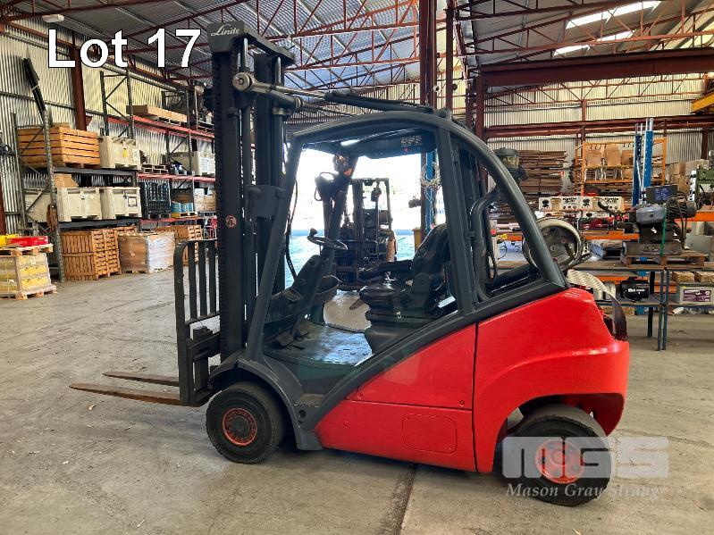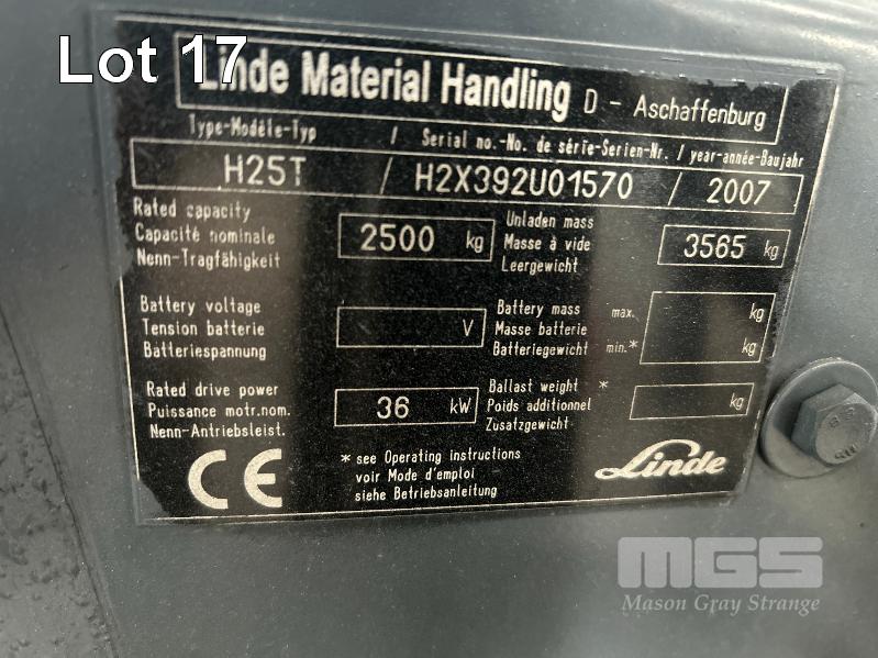 2007 FORKLIFT, LINDE MOD: H25T S/NO: H2X392U01570 RATED CAPACITY: 2,500kg SAFE WORK LOAD: 2,230kg MAX LIFT HEIGHT: 4,050mm 4 CYLINDER ENGINE, LPG HOURS: 13,606 SHOWING CLEAR VIEW 2 STAGE MAST KEY #41