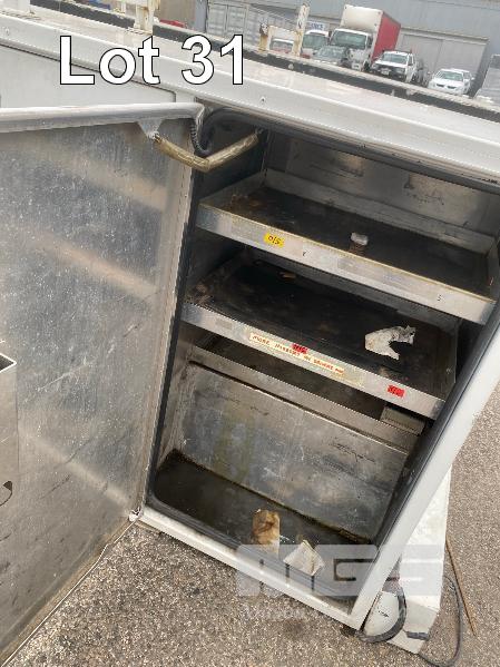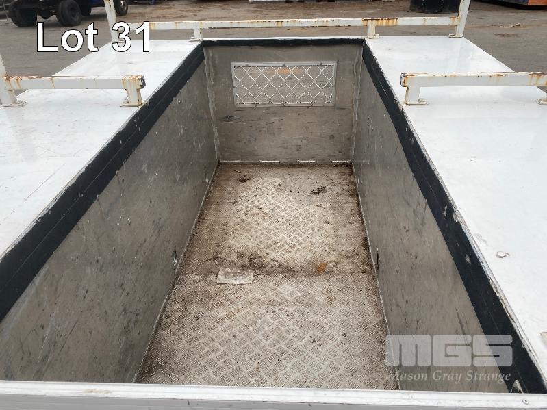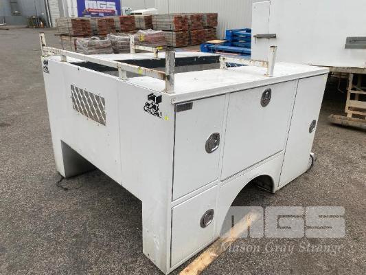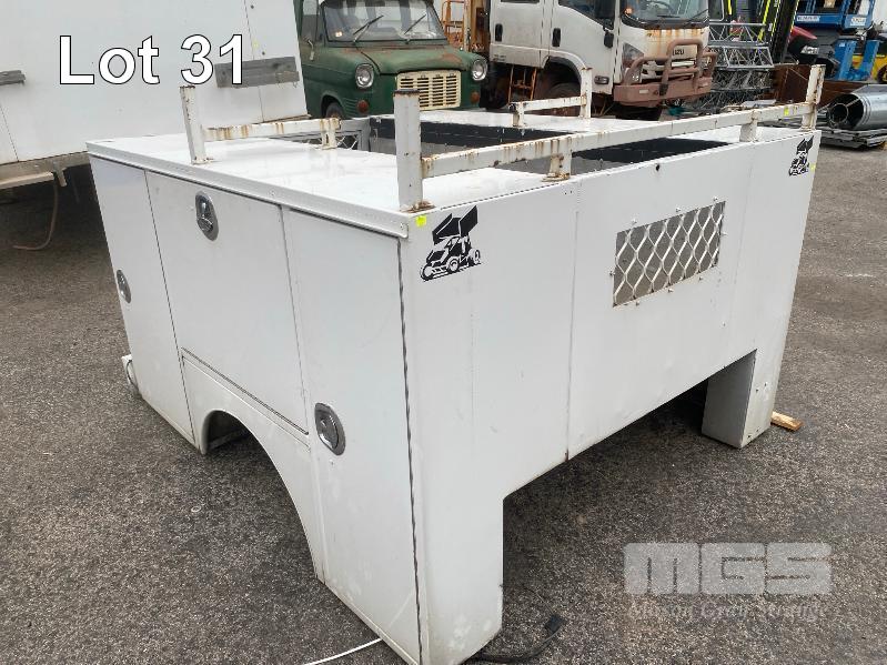 UTILITY TRADE/SERVICE BODY, PACIFIC BODYWORKS WHITE, ALLOY CONSTRUCTION FITTED WITH 7 x ASSORTED STORAGE COMPARTMENTS WITH LOCKABLE DOORS, SLIDE OUT DRAWERS & SHELVING, ROOF RACKS & OPEN CENTRE AREA, 2000 x 850mm TOTAL SIZE OF BODY: 2040 x 1860 x 1150mm (H)