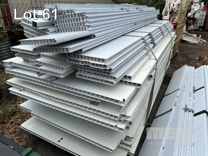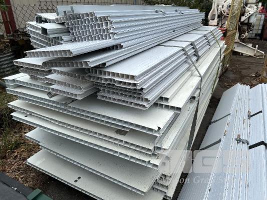 INTERNAL PARTITIONING & SCREENING SYSTEM HOARDFAST PANELS, PVC, MODULAR, FREE STANDING VARIOUS SIZES FROM 3000 x 300 (W) x 30mm THICK TO 3000 x 1200 (W) x 35mm THICK USED FOR TEMPORARY WALLS 50 (APPROX) x BASE PLATE SUPPORT POSTS 107 (APPROX) x BASE WEIGHTS WITH JOINERS 2 x PALLETS & 1 x STILLAGE (STILLAGE NOT INCLUDED)