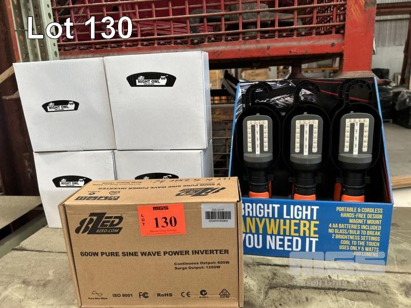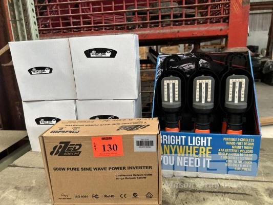 POWER INVERTER, 8ZED 600w PURE SINE WAVE 12VDC TO 240VAC 4 x LED WORK LIGHTS, NIGHT OWL RECHARGEABLE & 6 x LED WORK LIGHTS LYNX, HAND HELD & MAGNETIC BASE, RECHARGEABLE, AS NEW