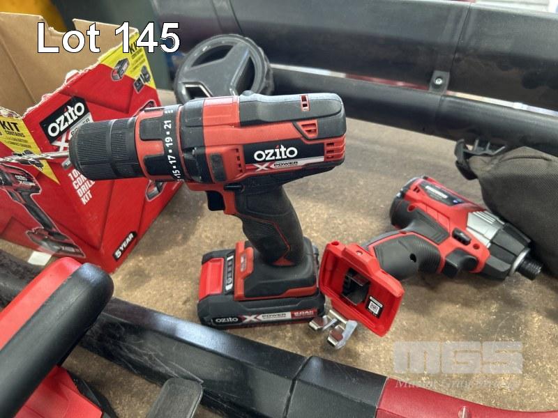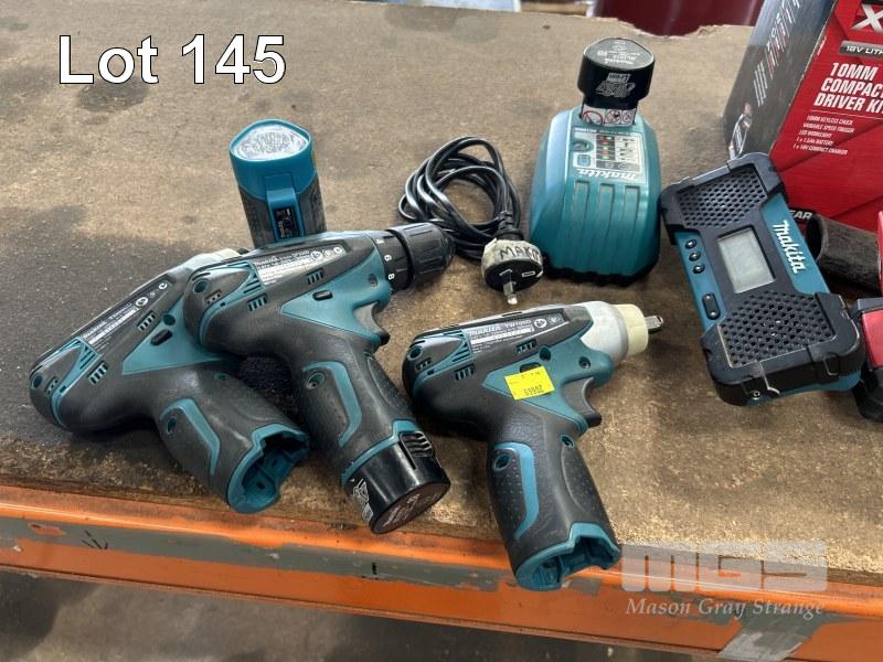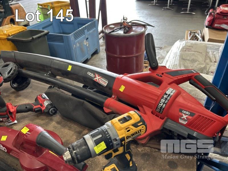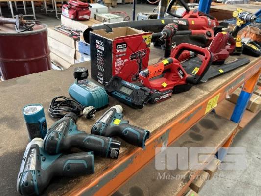 POWER TOOLS INCLUDING MAKITA CORDLESS DRILL, DRIVERS & LIGHTS, TFO90D, TWI00D & DE330D, 2 x BATTERIES & CHARGER, OZITO BRUSH CUTTER, BLOWER, DRILL & DRIVER WITH 2 x BATTERIES, DEWALT DRILL, DCD769 WITH BATTERY & CHARGER