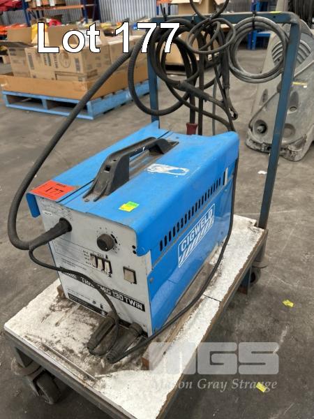 MIG WELDER, CIGWELD TRANSMIG 130 TWIN 240V WITH GAS REG, HAND PIECE, LEADS, TROLLEY MOUNTED