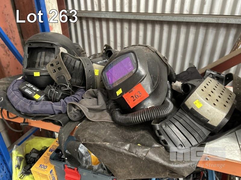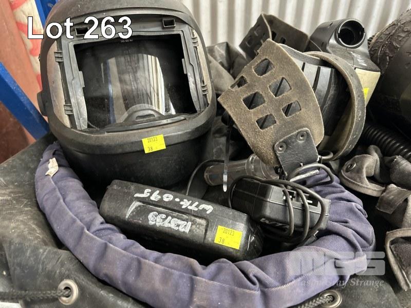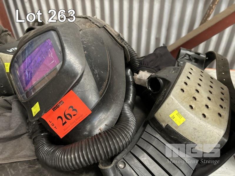 2 x POSITIVE AIR FEED WELDING HELMETS, 3M ADFLO WITH 2 x CORDLESS FAN UNITS, 1 x BATTERY & CHARGER IN CARRY BAGS