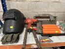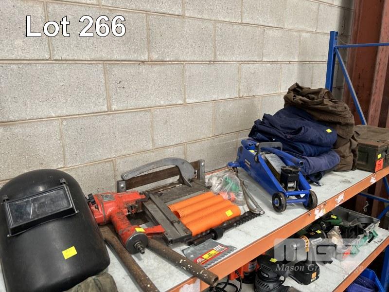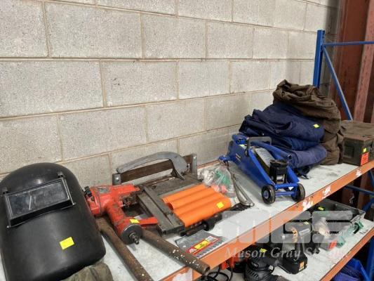 TROLLEY JACK, KINGCROME 1,350kg CAP PNEUMATIC STAPLE/BRAD GUN, MASONRY DRILL BITS, TILE CUTTER, OVERALLS, AMMO BOX, ETC 1 x SHELF