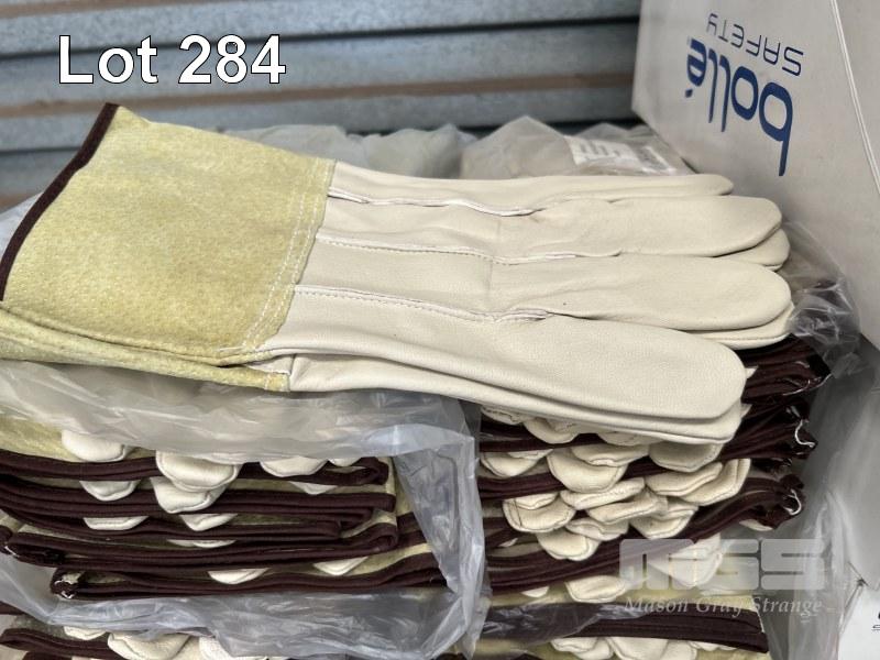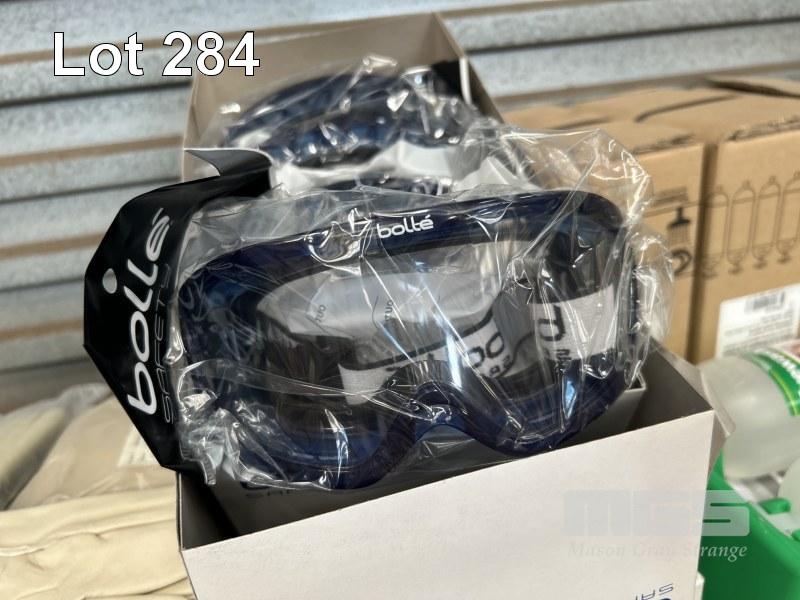 SAFETY EYE WASH SYSTEMS, TOBINS EMERGENCY EYE WASH STATION, WALL MOUNT, TWIN BOTTLE, 4 x UNITS & 5 x REFILLS, SAFETY GOGGLES, BOLLE CLEAR, 2 x BOXES, (5/BOX), 24 x LEATHER GLOVES, SIZE: M 12 x PAIRS WELDERS GLOVES