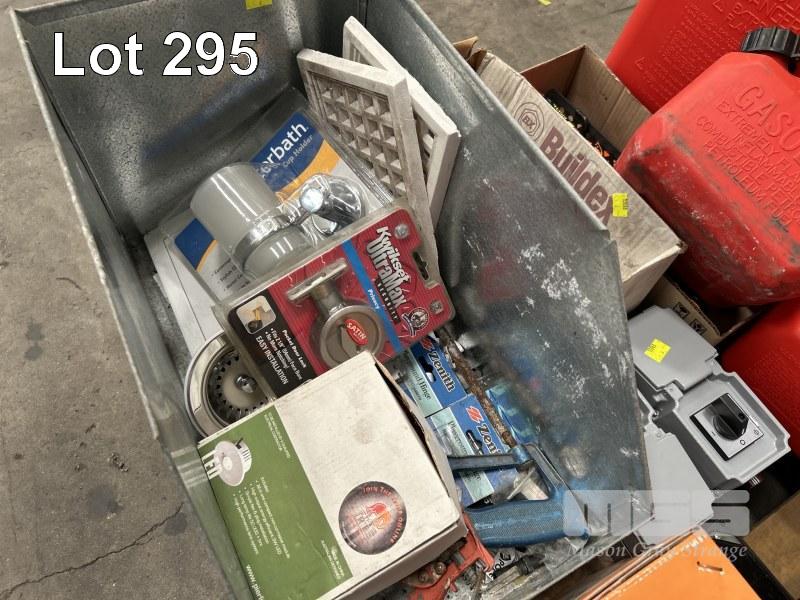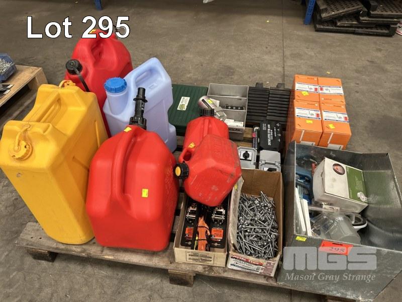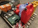 6 x JERRY CANS, POLY, 20 TO 5 LITRE, JUMPER CABLES, 2 x WEATHERPROOF GPO'S, CAR STOP WEDGES, MULTI BIT SET, HITACHI, BATH/SHOWER MIXER TAPS, ETC 1 x PALLET