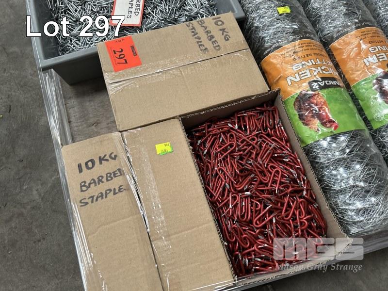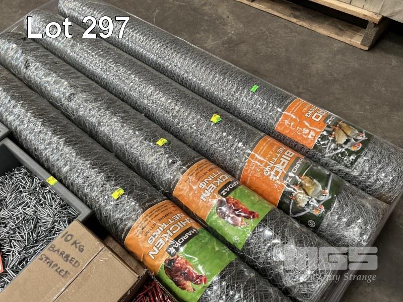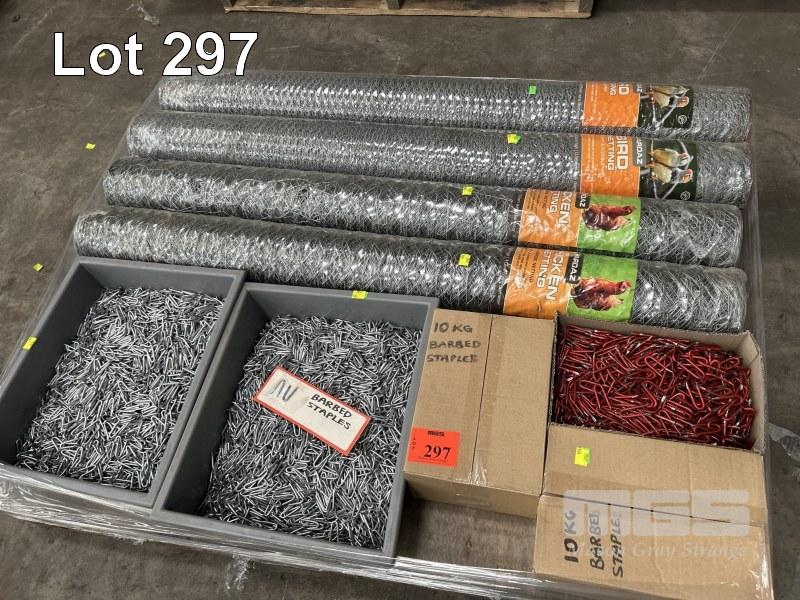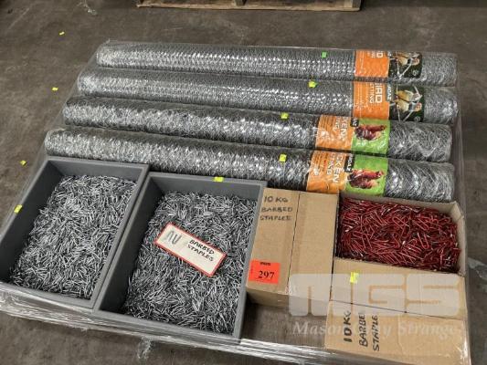 MESH FENCING WIRE, HARDAZ, BIRD & CHICKEN, GALV STEEL, 4 x ROLLS, 1200mm x 30m WITH LARGE QUANTITY BARBED STAPLES, 3 x BOXES & 2 x TUBS 1 x PALLET