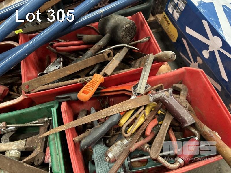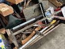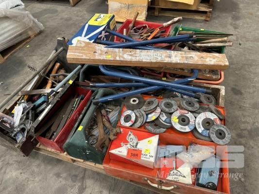 LARGE QUANTITY HAND TOOLS INCLUDING SAW HORSE STANDS, FILES, PRY BARS, HAMMERS, RIVET GUNS, SHIFERS, GRINDING DISCS, ETC, 1 x PALLET