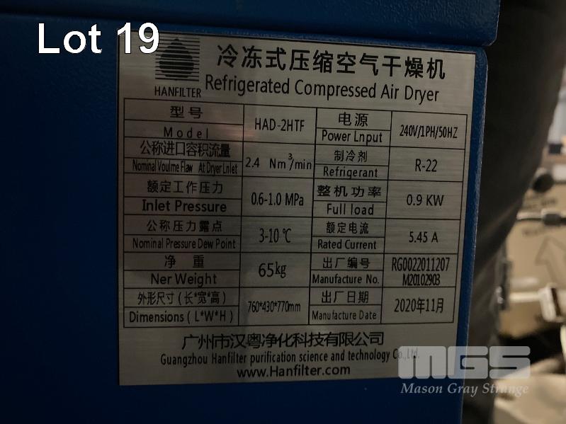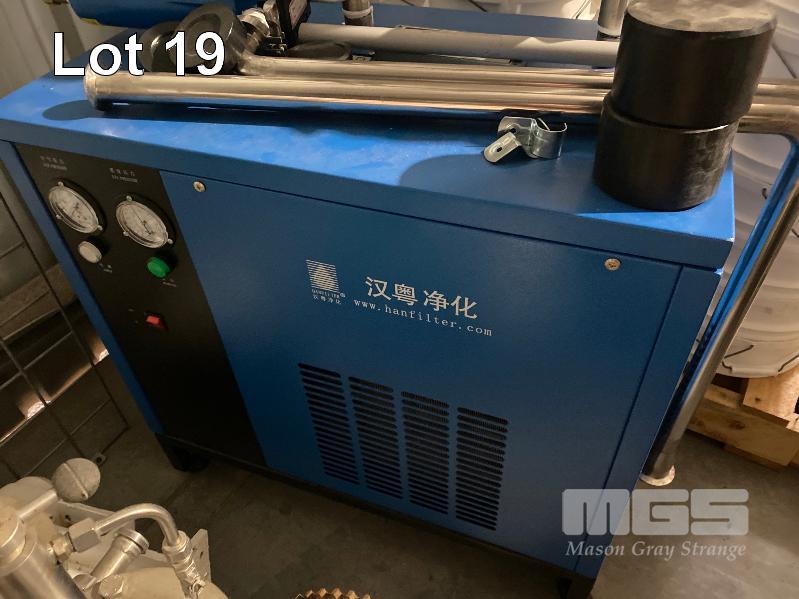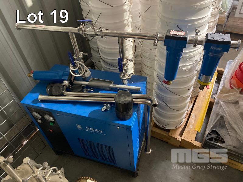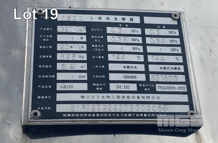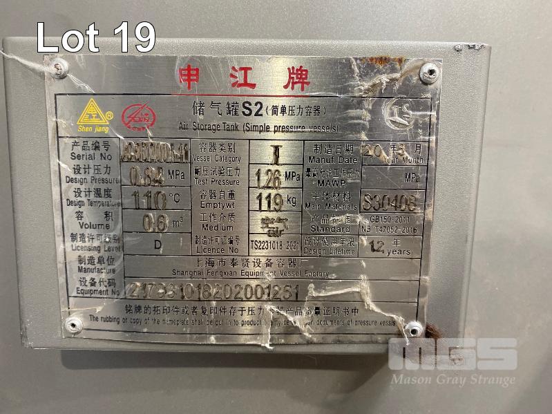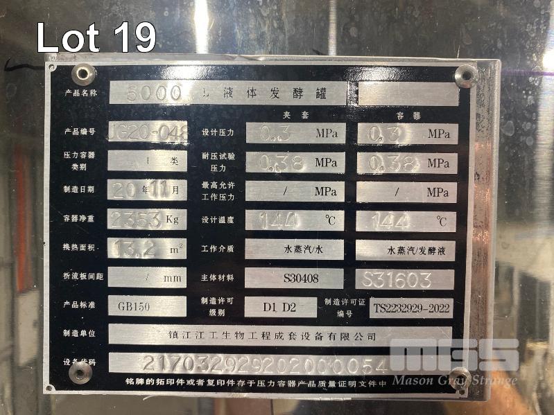 BIO REACTOR SYSTEM COMPRISING: - ZHENJIANG JIANGGONG BIOLOGICAL ENGINEERING COMPLETE EQUIPMENT CO. 5000L STAINLESS STEEL LIQUID FERMENTATION VESSEL, PRODUCT NUMBER: JG20-049, SERIAL: 217032929202000054, DOM: 2011 S30408 STAINLESS STEEL CONSTRUCTION, HEAT EXCHANGE AREA: 13.2m2, CONTAINER DESIGN PRESSURE: 0.3MPa, SET TEMPARATURE: 144 DEGREES CELCIUS - ZHENJIANG JIANGGONG BIOLOGICAL ENGINEERING COMPLETE EQUIPMENT CO. 1300L STAINLESS STEEL LIQUID FERMENTATION VESSEL PRODUCT NUMBER: JG20-047, SERIAL: 2170329292020053, DOM: 2011 S30408 STAINLESS STEEL CONSTRUCTION, HEAT EXCHANGE AREA: 5.4m2, CONTAINER DESIGN PRESSURE: 0.3MPa, SET TEMPARATURE: 144 DEGREES CELCIUS - ZHENJIANG JIANGGONG BIOLOGICAL ENGINEERING COMPLETE EQUIPMENT CO. AUTOMATIC CONTROL SYSTEM, MODEL: SFAT-8000C, TOUCH SCREEN, EMERGENCY STOP, LOCKABLE CABINET, WIRING DIAGRAM INCLUDED - GUANGHOU HANYUE PURIFICATION TECHNOLOGY CO. REFRIGERATED COMPRESSED AIR DRYER MODEL: HAD-2HTF DOM: 2020 SERIAL: RG0022011207 0.9kw - SHENJIANG UPRIGHT AIR RECEIVER DOM: 2021 SERIAL: JCBD2001-11 VOLUME: 0.6m2