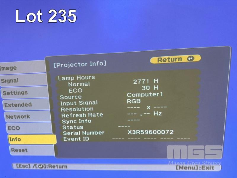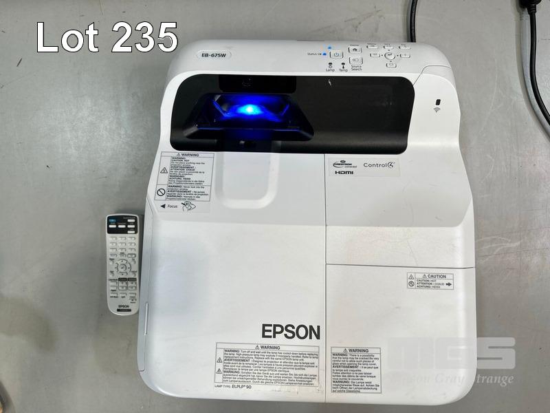 PROJECTOR, EPSON EB-675W ULTRA SHORT-THROW 3LCD, 3,200 LUMENS, 2,771 NORMAL & 30 ECO HOURS SHOWING WITH REMOTE S/N:X3R59600072