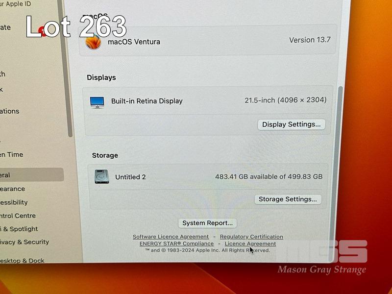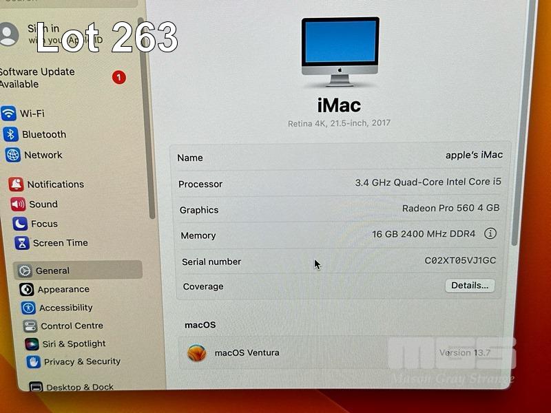 APPLE iMAC (A1418), CORE i5 7500 (7TH GEN) @ 3.4GHz, 16GB DDR4 RAM, 512GB SSD, BUILT-IN 21.5" RETINA DISPLAY (4096x2304), 4GB RADEON PRO 560 VIDEO, Wi-Fi, BLUETOOTH, MAC OS 13 INSTALLED, KEYBOARD & MOUSE S/N:C02XT05VJ1GC