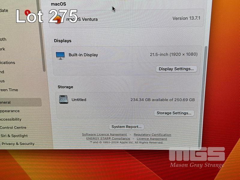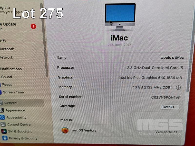 APPLE iMAC (A1418), CORE i5 7360U (7TH GEN) @ 2.3GHz, 16GB DDR4 RAM, 256GB SSD, BUILT-IN 21.5" DISPLAY (1920x1080), INTEL IRIS PLUS GRAPHICS 640, Wi-Fi, BLUETOOTH, MAC OS 13 INSTALLED (NO KEYBOARD, NO MOUSE) S/N:C02VN0FQH7VF