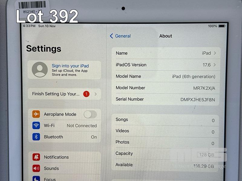 APPLE iPAD 6TH GEN, 128GB, Wi-Fi, SILVER, MODEL MR7K2X/A, A1893 WITH COVER (NO CABLE, NO CHARGER) S/N:DMPXJHE5JF8N