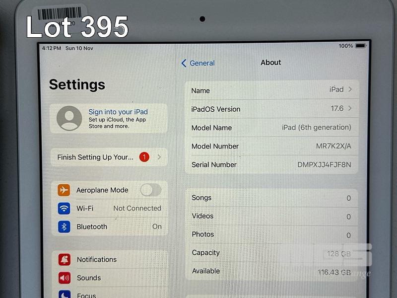 APPLE iPAD 6TH GEN, 128GB, Wi-Fi, SILVER, MODEL MR7K2X/A, A1893 WITH COVER (NO CABLE, NO CHARGER) S/N:DMPXJJ4FJF8N