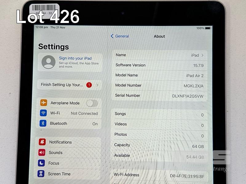 APPLE iPAD AIR 2, 64GB, Wi-Fi, SPACE GREY, MODEL MGKL2X/A, A1566 (NO CABLE, NO CHARGER) S/N:DLXNF1A2G5VW
