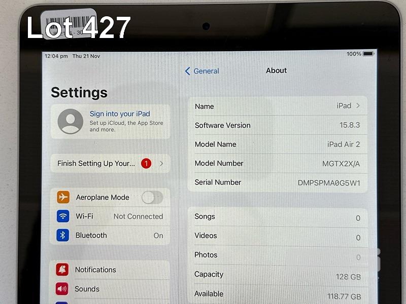 APPLE iPAD AIR 2, 128GB, Wi-Fi, SPACE GREY, MODEL MGTX2X/A, A1566 (NO CABLE, NO CHARGER) (NOTE: SCRATCHES ON SCREEN) S/N:DMPSPMA0G5W1