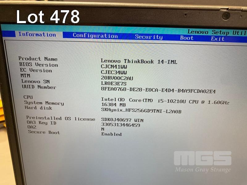 LAPTOP, LENOVO THINKBOOK 14-IML, TYPE 20RV, CORE i5 10210U (10TH GEN) @ 1.6GHz, 16GB DDR4 RAM, 256GB NVMe M.2 SSD, 14" WIDESCREEN (1920x1080), INTEL UHD GRAPHICS, Wi-Fi, BLUETOOTH, WINDOWS 11 PRO INSTALLED & POWER SUPPLY (NOTE: SMALL DENT ON CASING) S/N:LR0E3E7S