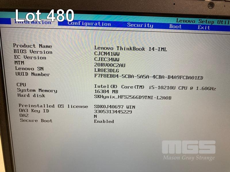 LAPTOP, LENOVO THINKBOOK 14-IML, TYPE 20RV, CORE i5 10210U (10TH GEN) @ 1.6GHz, 16GB DDR4 RAM, 256GB NVMe M.2 SSD, 14" WIDESCREEN (1920x1080), INTEL UHD GRAPHICS, Wi-Fi, BLUETOOTH, WINDOWS 11 PRO INSTALLED & POWER SUPPLY (NOTE: SMALL DENT ON CASING) S/N:LR0E3DLG